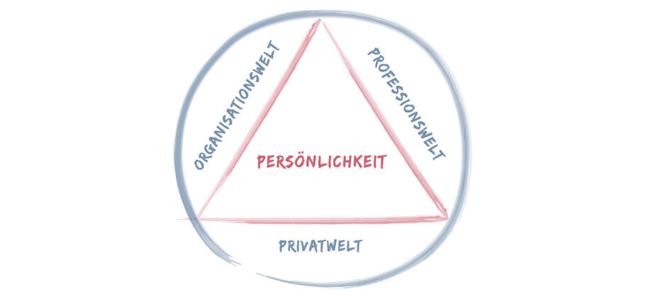 Um das besser zu verstehen und solche Problemsituationen aktiv zu vermeiden, hilft es, sich mit einem Konzept des Psychologen und Coach Bernd Schmid zu befassen. Er hat das "Drei-Welten-Modell der Persönlichkeit" entwickelt, nach dem der berufstätige Mensch Rollen in – wie der Name schon sagt – drei Welten einnimmt: Privatwelt, Professionswelt und Organisationswelt (Bild 1).