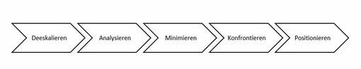 Wer sich gegenüber schwierigen Menschen behaupten will, dem hilft ein fünfstufiger Konfliktbewältigungsprozess. In den Phasen 1-3 hat dieser Prozess zunächst das Ziel, die eigene Aufgebrachtheit bzw. den eigenen Ärger auf ein Minimum zu reduzieren. Erst dann steht an, in den (kritischen) Ausdruck zu gehen und abschließend zu entscheiden, mit welcher Haltung ein für sich erträgliches Ende herbeigeführt werden kann. Die folgende Abbildung und die untenstehende Tabelle skizzieren diese fünf Phasen der Konflikt- bzw. Ärgerbewältigung.