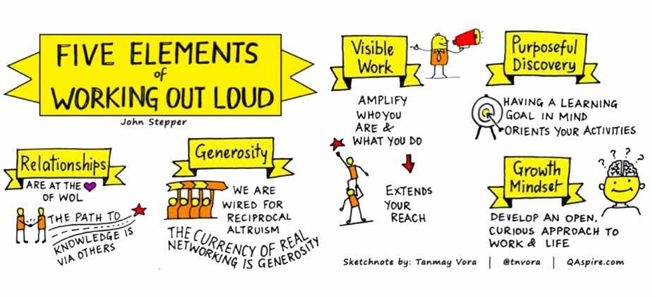 Working out loud ist somit eine Haltung und ein Lernprogramm, das Menschen ermöglicht, auf kommunikativer und kollaborativer Ebene Silos aufzubrechen, Wissen transparent zu machen und aktiv zu teilen, besser zu kommunizieren und effizienter zusammenzuarbeiten.