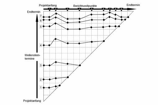 - Prognoselinien der Meilensteine des Projekts in Form eines MTA-Diagramms