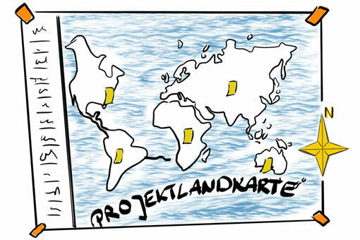 Die Projektlandkarte visualisiert Projektinformationen und ihre Zusammenhänge. Die Visualisierung in Form einer Landkarte ist einfach umzusetzen und stellt die oft komplexen Zusammenhänge einprägsam dar. Die Projektlandkarte ist ein individuell gestaltbares Werkzeug, das in der Initiierungsphase genauso wie in der Durchführungsphase hilfreich sein kann.