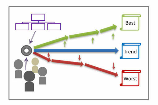 Die Szenariotechnik entwickelt anhand von Annahmen und der Analyse möglicher Einflussfaktoren Prognosen für den zukünftigen Projektverlauf. Eine positive Projektion (Best Case) zeigt den idealen Verlauf unter günstigen Annahmen, eine negative Prognose (Worst Case) die Entwicklung unter denkbar ungünstigen Annahmen. Weitere Szenarien sind möglich, z.B. eine Trendprojektion, die den vermuteten wahrscheinlichsten Verlauf abbildet. Die Analyse und Bewertung der Szenarien dient zur Entwicklung von Strategien und Maßnahmen für das weitere Vorgehen.