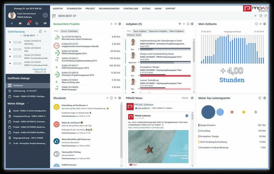 PROAD ist eine Projektmanagement-Software für Dienstleister und Agenturen, die ihre Projekte und Prozesse optimieren möchten: Eine einzige Software für CRM, Ressourcenplanung, Aufgabenmanagement, Zeiterfassung, Abrechnung und Projektcontrolling