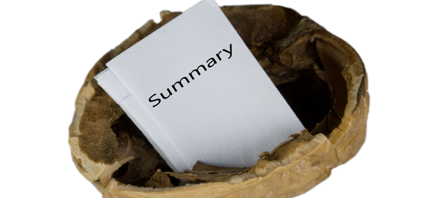 Management Summarys sind in Projekten häufig für Entscheidungsvorlagen erforderlich, z.B. für einen bewerteten Änderungsantrag oder eine Auftragsvergabe. Ein einfaches Summary kann aus einem einzigen Satz bestehen, wie z.B. "Für die Lieferung der Steuerungseinheit empfehlen wir die ACME GmbH & Co KG, da ihr Testprodukt bei der Qualitätsprüfung die mit Abstand besten Ergebnisse gezeigt hat." Die anschließenden, nur für einen Spezialisten verständlichen, fünfzig Seiten Testprotokoll wird der Leiter Einkauf sicher nicht durcharbeiten.