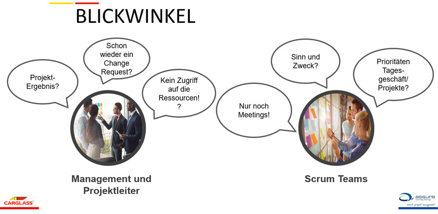 Zunächst führte der Head of Project Management gemeinsam mit dem Leiter Softwareentwicklung Scrum in der IT von Carglass ein. Die genaue Zielvorgabe dabei: Alle sechs Teams sollen alle IT-Anforderungen aus dem Tagesgeschäft und aus Projekten, aber auch Incidents und Wartungsaufträge im Rahmen des Scrum-Prozesses abwickeln. IT- und vor allem Non-IT-Projekten ist es jedoch freigestellt, agile Vorgehensweisen zu verwenden. Die Folge: An der Schnittstelle zur IT kommt es oft zu hybriden Vorgehensmodellen. So entwickelt ein Projektteam, das nach Wasserfall arbeitet, beispielsweise innerhalb der Realisierungsphase auf Basis von Scrum. Die große Anzahl parallel verlaufender Aufträge und Projekte macht es allerdings schwer, sich thematisch zu fokussieren, und objektive Prioritäten festzulegen.