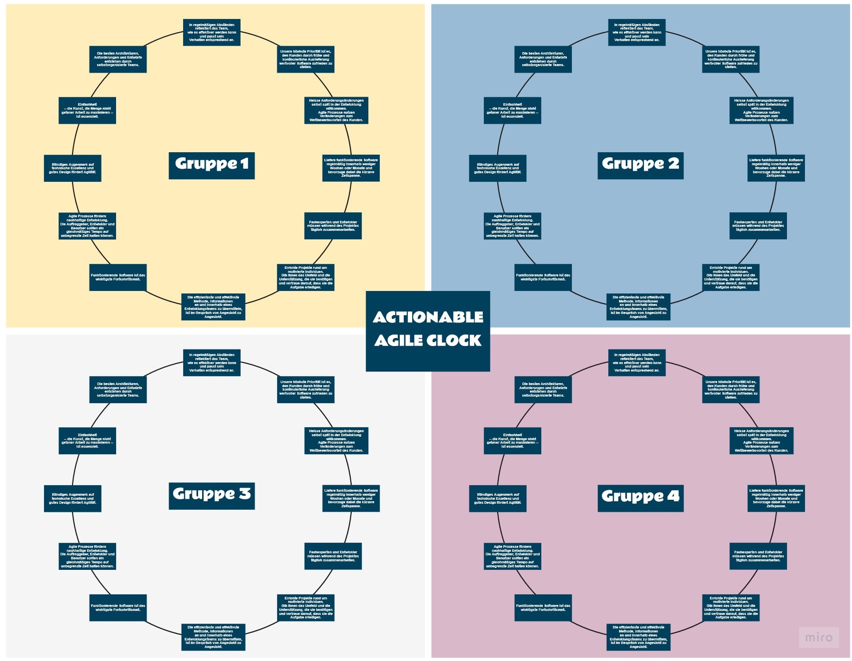 - Bei virtuellen Treffen: ein vorbereitetes Online-Whiteboard mit bis zu vier Arbeitsflächen mit je einer runden Uhr, auf der statt der Stundenangabe jeweils der vollständige Text eines der agilen Prinzipien steht (Bild 1). Eine Vorlage der beschrifteten Agile Clock in höherer Auflösung können Sie über den "Download"-Butten neben dem Artikel herunterladen.