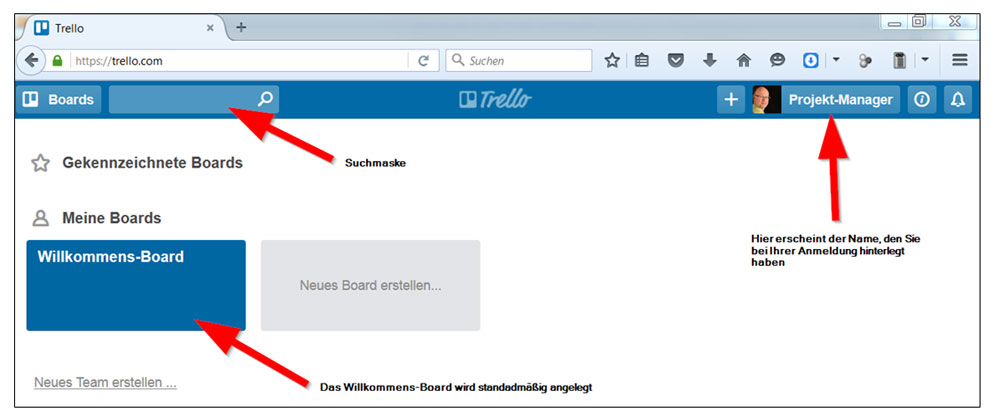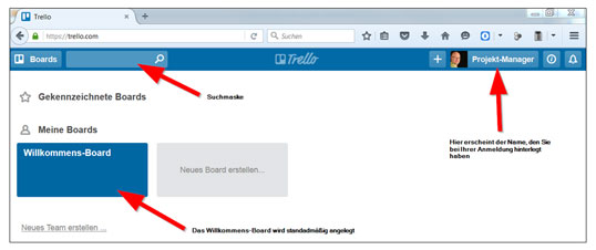 Ein Projekt entspricht in Trello jeweils einem Board. Das erste Board ist bereits vorhanden, nämlich das Willkommens-Board, in welchem Ihnen der Hersteller einige nützliche Informationen bietet (Bild 1).