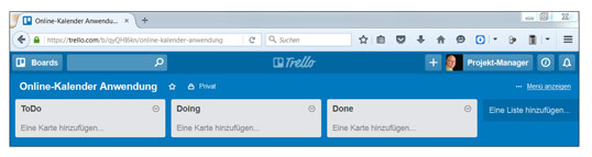 Das Online-Tool Trello vom Hersteller Trello Inc. (2014 ausgegliedert aus Fog Creek Software) bietet hier ein einfaches Planungs- und Kollaborationsinstrument. Das Tool orientiert sich in seinem Aufbau an der Kanban-Methode und ist in der Basis-Version kostenlos. Trello überzeugt den Benutzer mit seinem aufgeräumten und optisch ansprechenden Design. Gerade diese visuelle Darstellung erleichtert es allen Projektbeteiligten, den Überblick über Projektstatus und Aufgaben zu behalten.