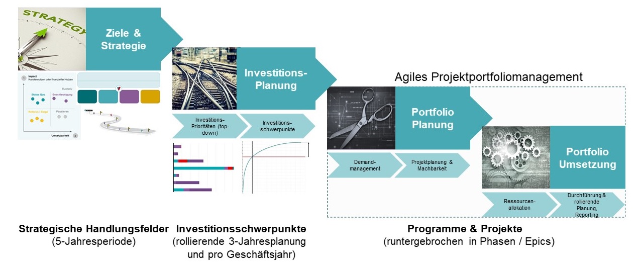 Damit eine agile, vom Geschäftsjahr unabhängige Projektportfolioführung funktionieren kann, bedarf es einer gut geführten Investitionsplanung (top-down). Diese sollte für die Führung des Projektportfolios klare Ziele und Rahmenbedingungen schaffen.