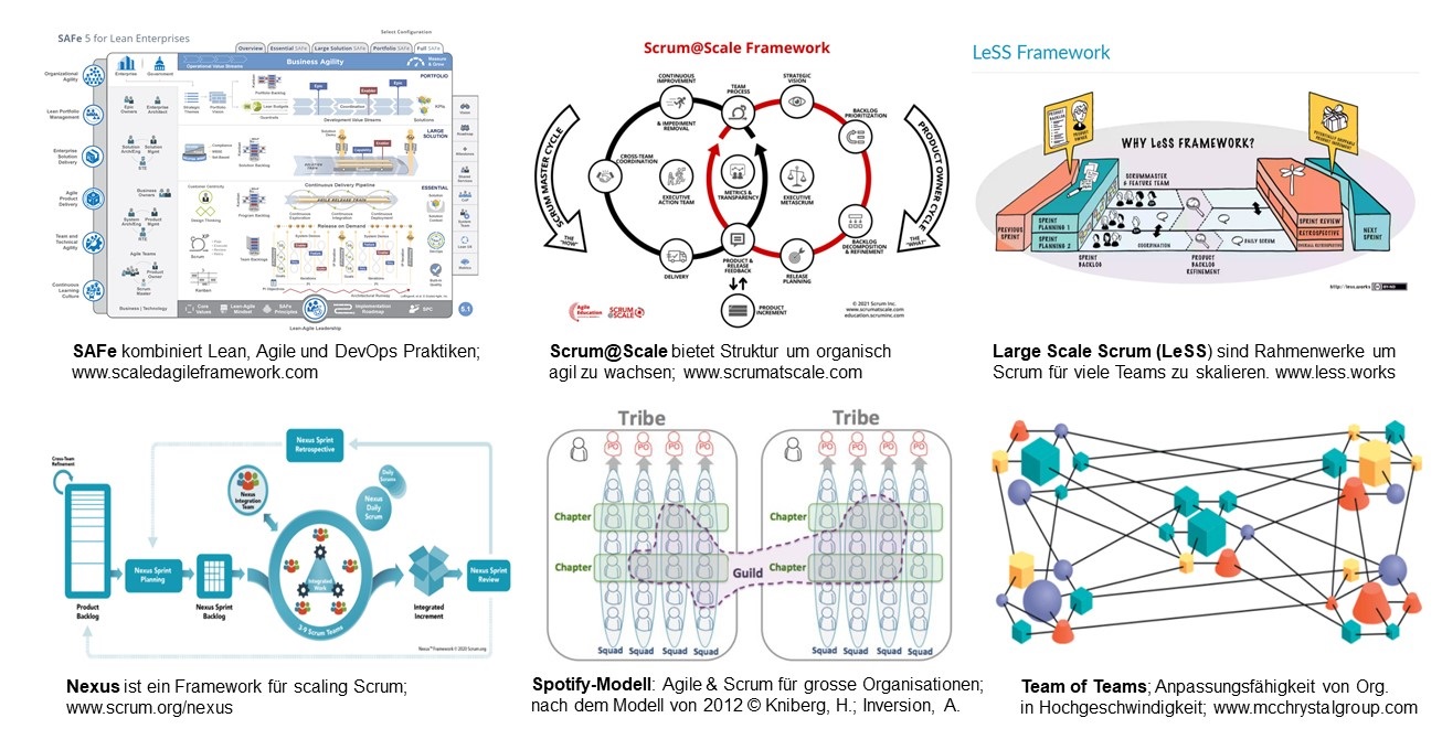 Wer eine Transformation hin zu agilen Denkweisen und Prozessen anstrebt, hat die Wahl zwischen unterschiedlichen Vorgehensmodellen. Immer mehr Unternehmungen passen ihre interne Organisation an und arbeiten in wertschöpfungsketten-basierten Einheiten mit stehenden Teams. Dabei kommen agile skalierte Modelle zum Einsatz wie z.B. SAFe (Scaled Agile Framework) oder LeSS (Large Scale Scrum) (Bild 2).