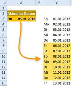 Bild 1: Die nächsten sieben Kalendertage – ausgehend vom Startdatum – automatisch farbig hervorheben.