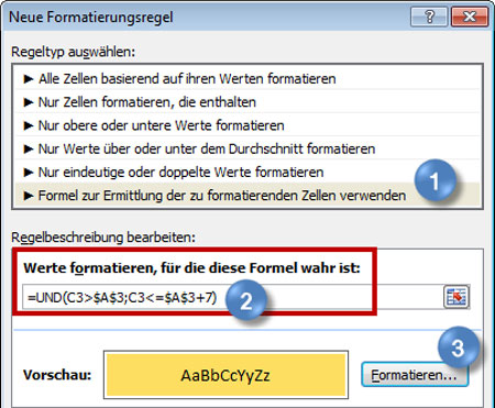- Tragen Sie in das Eingabefeld unter "Werte formatieren, für die diese Formel wahr ist" folgende Formel ein: =UND(C3>$A$3;C3<=$A$3+7).