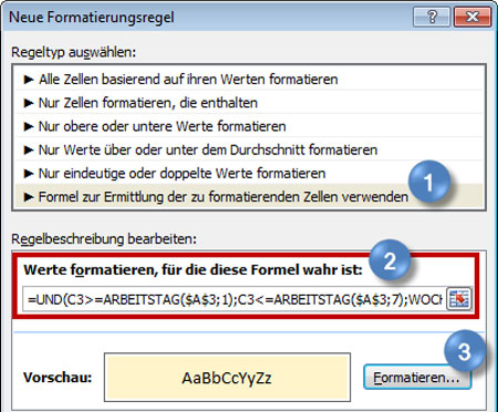 Sie möchten nicht die Termine der kommenden sieben Kalendertage, sondern die der nächsten sieben Arbeitstage kennzeichnen? Gehen Sie wie oben beschrieben vor und erweitern Sie die Formel um die Funktionen WOCHENTAG und ARBEITSTAG: