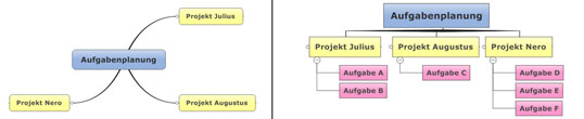 Um die Map möglichst übersichtlich zu gestalten, eignet sich besonders gut die Darstellung als Organigramm. Erstellen Sie dafür eine neue Map und benennen Sie das Hauptthema (z.B. "Aufgabenplanung"). Als nächstes fügen Sie die Hauptzweige für die Oberbegriffe hinzu und benennen diese ebenfalls (Bild 2 links). Um schließlich das Organigramm zu erstellen (Bild 2 rechts), markieren Sie das Hauptthema und gehen zu Entwurf / Objektformat / Zweiganordnung / Organigramm (in MindManager 9: Start / Format / Zweiganordnung / Organigramm).