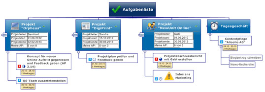 In Bild 1 ist die Aufgabenliste eines Mitarbeiters zu sehen, der in einem fiktiven Medienunternehmen tätig ist. Die einzelnen Aufgaben sind dabei bestimmten Oberbegriffen zugeordnet, die der Mitarbeiter frei gewählt hat. In unserem Beispiel unterteilt er seinen Aufgabenplan in das Tagesgeschäft sowie in drei parallel laufende Projekte, an denen er gerade beteiligt ist.