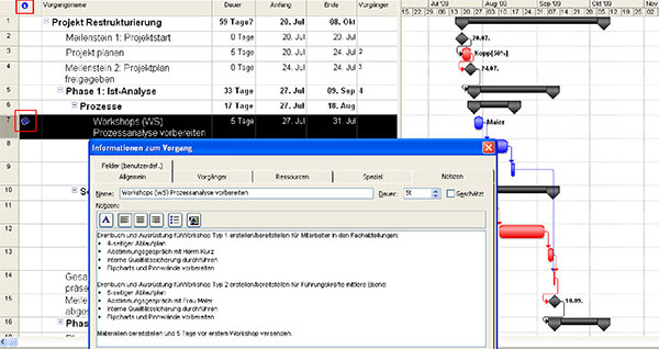 Mit einem Doppelklick auf das Arbeitspaket öffnet sich das Fenster "Informationen zum Vorgang". Klicken Sie auf den Reiter "Notizen". Dort ist ein Texteditor hinterlegt, in den Sie die Arbeitspaketbeschreibung eintragen können, z.B. als Checkliste, Vorgangsliste oder Ergebnisbeschreibung (s. Bild 1).
