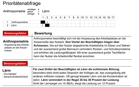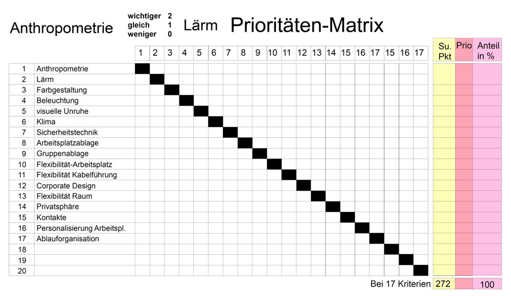Hier können Sie als Projektleiter von den Erfahrungen des Büroplaners Karl-Heinz Lauble lernen, der Anfang der 80er Jahre die Nutzwertanalyse für Büroarbeitsplätze entwickelte. Diese basiert auf einer systematischen Analyse der Faktoren, die die Qualität des Arbeitsplatzes bestimmen. Mit Hilfe dieses Kriterienkatalogs ist es möglich, die Anforderungen der Mitarbeiter zu bestimmen und daraus die Prioritäten von Maßnahmen zur Arbeitsplatz-Optimierung abzuleiten.