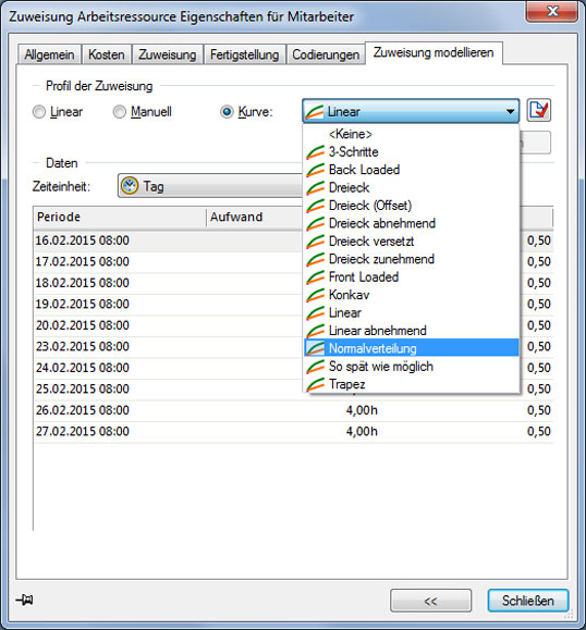 Der Aufwand für die Bearbeitung eines Vorgangs ist nicht immer zu jedem Zeitpunkt gleich hoch, sondern verläuft oft kurvenförmig. Die Bearbeitung kann zu Beginn z.B. wenig arbeitsintensiv sein, dann steigt die Belastung an, sinkt wieder ab und ist am Ende vielleicht wieder hoch. Um einen solchen Verlauf abzubilden, müsste der Anwender den Vorgang in mehrere Abschnitte aufteilen und jeweils unterschiedliche Einzelaufwände eingeben. Mit dem neuen Feature "Zuweisungskurven" lässt sich diese Herausforderung auf einfache Weise meistern. Klickt der Anwender mit der rechten Maustaste auf den Ressourcenbalken, öffnet sich das Menü "Eigenschaften" mit dem zusätzlichen Reiter "Zuweisung modellieren". Die Zuweisung "Linear" entspricht dabei der bisherigen Standardeinstellung, ein Klick auf die Zuweisungskurve "Normalverteilung" führt z.B. zur typischen Glockenverteilung, die ihr Maximum nach der Hälfte der Zeit erreicht und dann wieder abfällt.