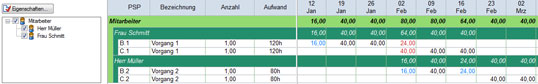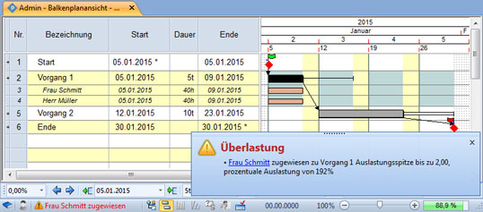 Bei Überlastung eines Mitarbeiters durch neue Zuweisungen erscheint der Warnhinweis rechts unten jetzt deutlich größer und auffälliger als bisher. Ein Klick auf den Mitarbeiter-Link (Bild 1) führt zur ausführlichen Auslastungsinformation. Nach wie vor ist es möglich, Mitarbeiter mehrfach zu verplanen, wenn man sich bewusst dafür entscheidet – z.B. weil man sich noch nicht endgültig festgelegt hat.