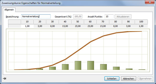 In der grafischen Darstellung (Bild 3) zeigen die Balken die prozentuale Verteilung an, die dunkelbraune Linie die kumulierte Aufwandskurve. Alle Werte können manuell geändert werden – entweder mit der Maus über die Veränderung der Balkenhöhe in den einzelnen Abschnitten oder durch das Eintippen neuer Werte in der darüber liegenden Tabelle. Nur wenn die Summe der eingegebenen Prozentwerte genau 100% entspricht, ist der Button "Übernehmen" freigeschaltet. Aus den eingegebenen Prozentwerten errechnet sich der Arbeitsaufwand pro Abschnitt. Ist ein Mitarbeiter z.B. mit insgesamt 20 Stunden für den Vorgang eingeplant und entfallen auf einen bestimmten Abschnitt davon 23 Prozent der Zeit, so entspricht das einem Arbeitsaufwand von 4,6 Stunden (20h * 0,23) für diesen Abschnitt.