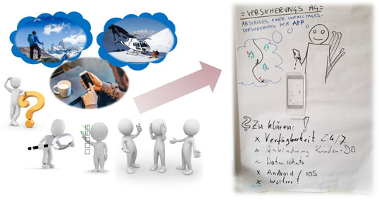 Beispiel: Eine solche Idee könnte darin bestehen, dass ein Urlauber in den Bergen spontan beim Frühstück entscheidet, Bergsteigen oder Skifahren zu gehen und für diese Aktivität eine Tagesunfallversicherung über sein Smartphone abschließen möchte. Der Anwendungsfall geht natürlich über den Abschluss der Versicherung hinaus. Der Abschluss der Versicherung über das Smartphone ist ein sogenannter "Touch-Point" (also eine Interaktion zwischen Kunde und Dienstleister), der im Rahmen einer Design-Phase weiter ausgearbeitet werden muss. Der vollständige Anwendungsfall kann mehrere Touch-Points enthalten, wie z.B. die Meldung eines Unfalls, die Stornierung oder Verlängerung der Versicherung, die Buchung von Zusatzoptionen oder den Abschluss weiterer Versicherungen. Zu jedem dieser Touch-Points könnte ein eigenes Design-Projekt gestartet werden.
