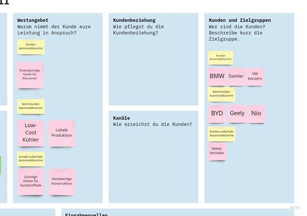 "CoolGrill verbindet schickes Design mit kostengünstiger Fertigung. Könnte das nicht auch interessant sein für Möbelhersteller?", überlegt Stefan laut und erntet zustimmendes Nicken. Neben diesem Zettel landen auch einige Startups aus dem Automobilbereich als neue Kunden im Feld Customer Segments.