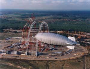 Dort entsteht in einer eigens konstruierten freitragenden Werfthalle diese moderne Neuauflage eines Zeppelins. Konzerne wie Siemens, Hochtief und Linde beteiligen sich an dem Projekt, das Bundeskanzler Gerhard Schröder wiederholt mit medienwirksamen Besuchen bedacht hat, um dem hohen Stellenwert des Vorhabens Ausdruck zu verleihen.