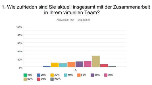 Bild 1: Fast 2/3 der Teilnehmer sind grundsätzlich zufrieden mit der Zusammenarbeit im virtuellen Team (mindestens 60% Zufriedenheit, das sind die fünf Balken ab dem violetten)