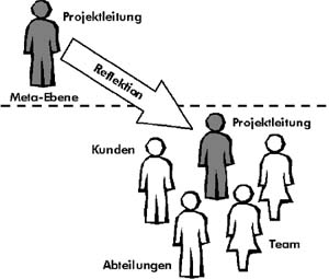 Coaching oder auch "Supervision" ("super-videre": von oben drauf schauen) bietet die Möglichkeit, von einer Metaebene aus, das gesamte Projektsystem einschließlich der Rolle der Projektleitung zu betrachten und zu reflektieren.