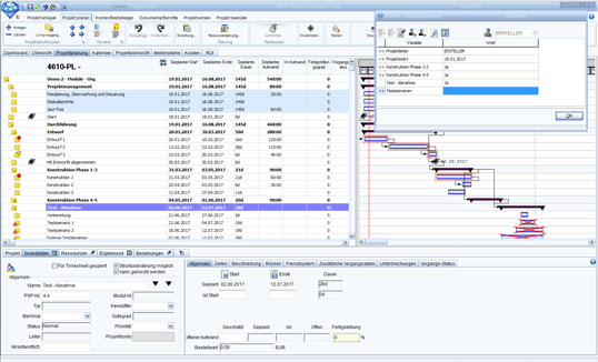 - Ist eine Skizze genehmigt, beginnt die Projekt-Planung. Diese umfasst eine Termin-, Ressourcen- und Sachmittel-Planung sowie eine Projekt-Dokumentation, Risiko- und Nutzwert-Analyse, Bewertung oder eine Budget- und Kostenkalkulation. Collinor unterstützt dabei eine grobe Ressourcenplanung (z.B. über Abteilungen) auf Phasen oder Arbeitspakete, die sich später weiter detaillieren lässt.