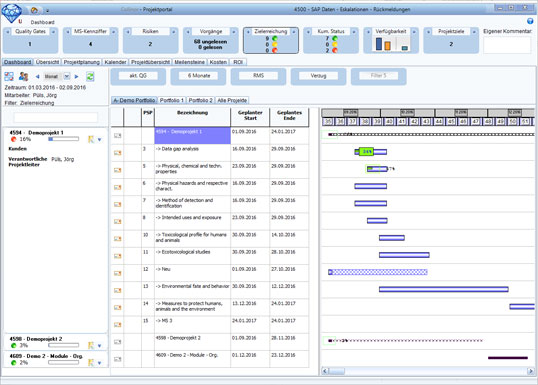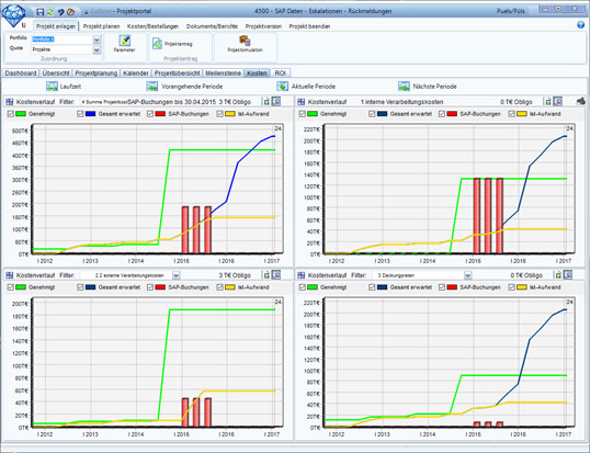 - Die Projekt-Durchführung beginnt, sobald der Projektantrag genehmigt ist. Bei der Durchführung werden u.a. Ist-Aufwendungen erfasst und z.B. Termine, Kosten und Risiken geplant und gesteuert. Das Risikomanagement unterscheidet zwischen Gesamtrisiken im Portfolio und arbeitspaketbezogenen Risiken und erfasst Kosten, Terminverzüge sowie Wahrscheinlichkeiten, die es auf das Projekt hochrechnet.