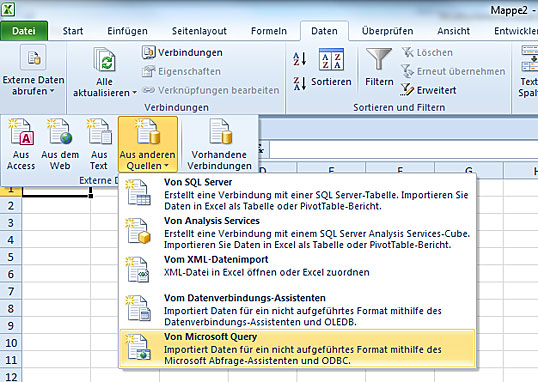 Standardmäßig bietet Excel Importmöglichkeiten für Daten aus unterschiedlichen Quellen, u.a. aus Access, dem Web und aus Textdateien. Sie finden die entsprechenden Befehle im Register Daten im Bereich Externe Daten abrufen (Bild 1). Hinter jeder der Optionen verbirgt sich ein Assistent, der den Anwender durch den Prozess der ODBC-Integration führt. Für einfache Abfragen z.B. aus externen Excel-Tabellenblättern reicht der ODBC-Abfrageassistent "Microsoft Query" aus, den Sie im Bereich Externe Daten abrufen über die Auswahl Aus anderen Quellen aufrufen.