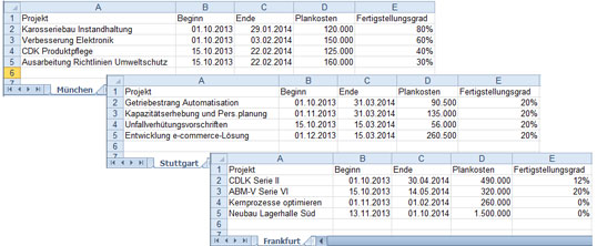 Bild 2: Drei Projektlisten in Excel-Tabellenblättern.