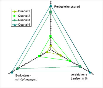 Meist endet die Interpretation des Symbols mit diesen Aussagen; während des Projekts kommt ihm keine weitere Bedeutung zu. Als neugieriger Mensch (was alle Projektmanager sein sollten) fragt man sich jedoch, ob man mit dem Symbol nicht auch präzisere Aussagen zu den drei dargestellten Größen treffen und somit deren Änderungen im Projektverlauf darstellen kann. Eine solche Neuinterpretation würde eine aussagekräftige Visualisierung des Projekt-Controllings erlauben.
