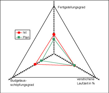 Würde sich z.B. die Laufzeit eines Projekts durch äußeren Zwang (Auftraggeber besteht auf früherer Lieferung) verkürzen, muss das Ergebnis dennoch gleich bleiben. In diesem Fall steigen die Kosten (sog. Beschleunigungskosten). Diese Änderungen gegenüber der ursprünglichen Planung sollten sich durch eine veränderte geometrische Form des Dreiecks symbolisieren lassen.