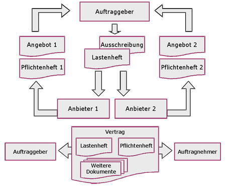 Bild 1: Ausschreibungsprozess mit Lastenheft und Pflichtenheft und anschließendem Vertrag.