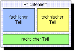 Das Verständnis über Aufbau und Inhalt eines Pflichtenhefts orientiert sich daran, vor welchem Hintergrund ein Pflichtenheft betrachtet wird. Für den Begriff des Pflichtenhefts gibt es verschiedenste Definitionen. Dies liegt daran, dass dieser Begriff mehrfach belegt ist. So wird ein Pflichtenheft nicht nur zur Erstellung von Software geschrieben. Auch in anderen Bereichen wie z.B. im Maschinenbau und der Fertigung gibt es die Form des Pflichtenhefts als Vorgabe für bestimmte Arbeiten. Für die weitere Betrachtungsweise wird das Pflichtenheft hier als die organisatorische und/oder technische Vorgabe zur Erstellung von Software definiert. In einem weiteren Schritt wird es in verschiedene Bereiche unterteilt, die im einzelnen separat behandelt werden.