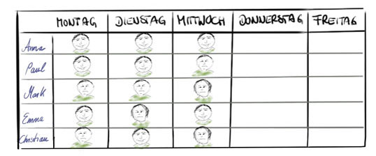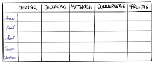 Als visueller Mensch entwarf ich dazu eine visuelle Lösung: Auf einem A3-Papier vermerkte ich zunächst die Wochentage als Spaltenköpfe und in den Zeilen jeweils den Namen eines Teammitglieds; auch für mich selbst legte ich eine Zeile an, denn ich wollte mit gutem Beispiel vorangehen (siehe Bild 1)