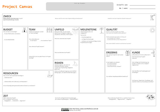Die von mir mitgegründete Initiative "Over the Fence – Projects Newly Discovered" (s.u.) entwickelte 2013 einen Project Canvas (siehe Bild 1), der unter der Creative Commons License kostenfrei unter http://overthefence.com.de/project-canvas als großformatige Mustervorlage zum Ausdrucken und Bearbeiten der Allgemeinheit zur Verfügung steht. Viele der bisherigen Anwender des Project Canvas gaben im Rahmen von "Over the Fence" Rückmeldungen über das Gute und das noch zu Verbessernde. Diese Vorschläge griffen wir auf und entwickelten den Project Canvas entsprechend weiter.
