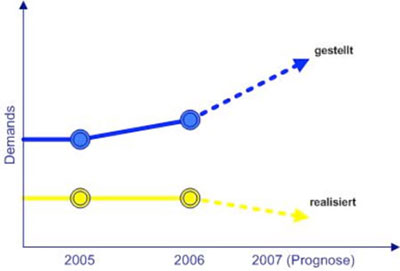 Anfang 2007 nahmen die Controller der IT-Abteilung eine Auswertung vor. Dabei stellten sie fest, dass die Anzahl der neuen Anforderungen, die an die internen IT-Systeme gestellt wurden (Demands), kontinuierlich gestiegen war. Die Zahl der Demands, die im Januar 2007 bereits erfasst waren, ließ auf das gesamte Jahr fortgeschrieben eine weitere, extreme Erhöhung erwarten. Gleichzeitig hatte das Top-Management das Budget für die Neu- und Weiterentwicklung von IT-Systemen gekürzt. Es war somit abzusehen, dass die IT-Abteilung im Jahr 2007 nur einen sehr kleinen Anteil der Demands würde umsetzen können (Bild 1).