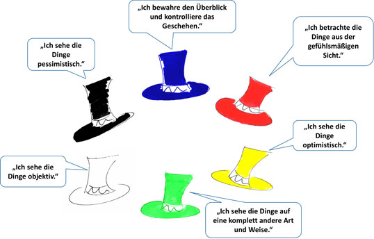 - roter Hut (Emotionen und Gefühle): Rot deutet auf Ärger, Zorn ("rot sehen") und Emotionen hin. Der rote Hut vermittelt die gefühlsmäßige Sicht.