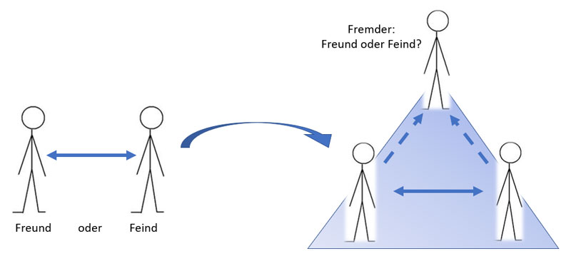 Während Freund und Feind sich in der Regel wie auf einer Linie konfrontativ gegenüberstehen, liegt der Platz des Fremden woanders. Mit dieser Positionierung abseits der zweidimensionalen Konfrontationslinie entsteht Raum. Dieser ermöglicht eine andere Art der Kommunikation und bringt eine zusätzliche Perspektive ein (Bild 1).