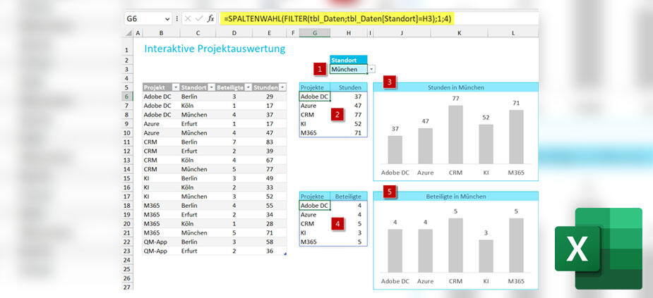 Dieser Artikel zeigt, wie Sie die Arrayfunktionen FILTER und SPALTENWAHL verwenden, um eine solche übersichtliche, interaktive und sich dynamisch anpassende Auswertung zu erstellen.