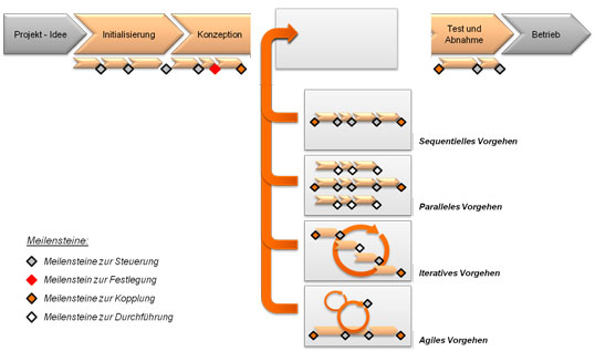 Das Steuerungsmodell wird in jedem Projekt durchlaufen. Zur Einbindung des ausgewählten Durchführungsmodells definieren zwei Meilensteine des Steuerungsmodells am Übergang zum Start und vom Ende des Durchführungsmodells eine sog. "feste Kopplung" (vgl. Bild 1, "Meilensteine zur Kopplung").