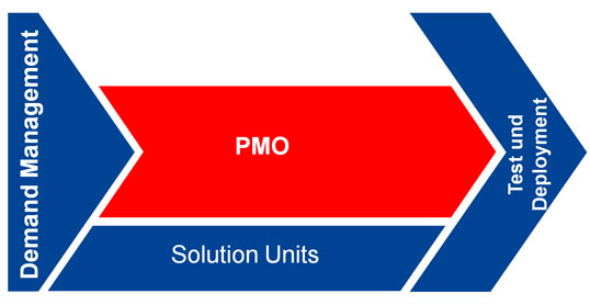 Das PMO stellt eine wichtige Schnittstelle zum zentralen Anforderungsmanagement (Demand Management), zu Solution Units und dem Bereich "Test und Deployment" dar. In Zusammenarbeit mit einem Mitarbeiter aus dem Anforderungsmanagement nimmt ein PMO-Mitarbeiter das Clustern und Priorisieren der Anforderungen unter Berücksichtigung der technischen Abhängigkeiten vor. In der Folge erhalten die Mitarbeiter dieser Entwicklungseinheiten ihre Aufträge. Ohne vorherige Abstimmung mit dem verantwortlichen Manager für Tests und Inbetriebnahme der Software kann keine Freigabe für ein Projekt und sein Entwicklungspaket gegeben werden und auch keine zeitliche Zusage für die Umsetzung einer Anforderung vom PMO gegenüber dem Anforderungsmanagement gegeben werden