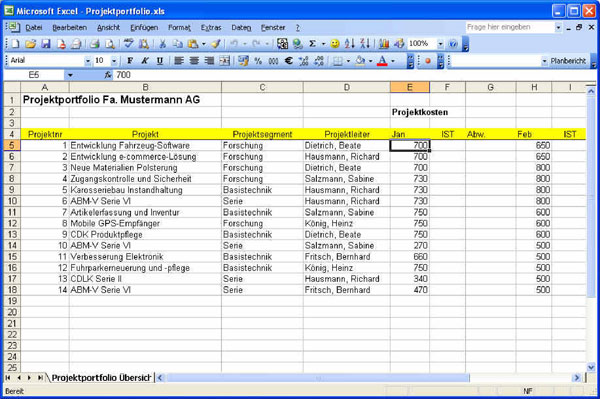 Bild 1 zeigt ein einfaches Beispiel für ein Projektportfolio. Es enthält eine Liste aller Projekte jeweils mit Projektsegment und zuständigem Projektleiter. Die Projektkosten (in Tausend EUR) werden pro Monat geplant und mit den IST-Kosten abgeglichen. (Im Beispiel exemplarisch nur für das erste Quartal). Sie können die Beispiel-Arbeitsmappe sowie die fertige Lösung zusammen mit dem Artikel herunterladen.