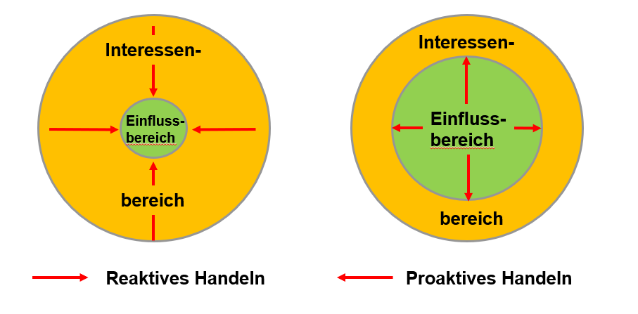 Wenn Sie reaktiv handeln, verkleinert sich Ihr Einflussbereich, da Ihr Handeln zunehmend von den Personen im Interessenbereich beeinflusst wird. Handeln Sie proaktiv, dann wird Ihr Einflussbereich größer, weil Sie selbst die Personen in Ihrem Interessenbereich beeinflussen.