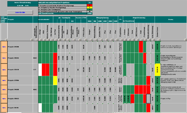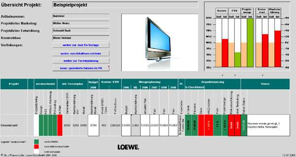 Projekttools werden oft als Allheilmittel angesehen und somit in ihren Möglichkeiten überschätzt. Ein geeignetes Tool allein bringt die Projektarbeit nicht weiter. Um einen Nutzen zu erzeugen, muss es sinnvoll an die Unternehmensgegebenheiten angepasst und konsequent eingesetzt werden. Nach einer einjährigen Evaluierungsphase entschieden wir uns bei Loewe dafür, eine Eigenentwicklung auf Basis von Microsoft Excel einzusetzen. Bei dieser Software mit der Bezeichnung "Projekthandbuch" wurde besonderer Wert darauf gelegt, dass sowohl allgemeine Fragen des Managements (z.B. eine schnelle Übersicht über die laufenden Projekte und deren Status) als auch die Detailfragen der Projektleiter und Teammitglieder (z.B. Terminpläne, Ergebnisse von Teamsitzungen) beantwortet werden können. Dafür visualisiert ein Ampelsystem auf der Einstiegsseite die wichtigsten Kennzahlen des Projekts (Bild 1). Sind mehrere Ampeln rot, erfordert das Vorhaben besondere Aufmerksamkeit.
