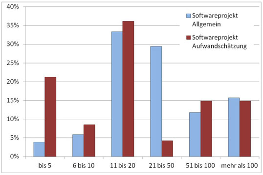 Um die Gründe für dieses Defizit herauszufinden, befragte eine Arbeitsgruppe der Wirtschafts- und Sozialwissenschaftlichen Fakultät der Universität zu Köln (Basten und Mellis, 2011) insgesamt 52 Projektmanager zu ihren Methoden und Erfahrungen hinsichtlich der Aufwandsschätzung von Software-Entwicklungsprojekten. Abgefragt wurden dabei die Systematik der Schätzungen, die eingesetzten Schätzverfahren sowie der von den Experten wahrgenommene Erfolg dieser Schätzungen.