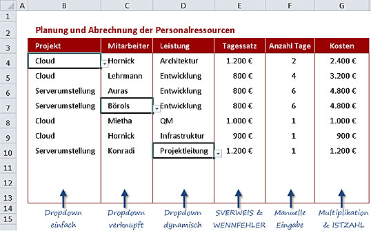 Als Beispiel dient hier die Planung des Mitarbeitereinsatzes in verschiedenen Projekten. Im Mittelpunkt steht dabei die Frage, wer wann in welchem Projekt welche Arbeit mit welchen Kosten erledigt. Eine Übersicht liefert eine Tabelle, in die zunächst der Projektname, anschließend der Name des Mitarbeiters und schließlich die von ihm zu erbringende Leistung eingetragen werden. Bild 1 zeigt eine Vorschau auf die fertige Lösung: Alle Angaben gelangen über Auswahllisten oder mittels Formeln in die Tabelle. Nur die Anzahl der Tage muss in Spalte F noch manuell eingetragen werden. Die Mitarbeiter-Auswahlliste passt ihren Inhalt mittels Verknüpfung automatisch so an, dass nur diejenigen Mitarbeiter angezeigt werden, die in dem Projekt mitarbeiten, das zuvor per Klick ausgewählt wurde.